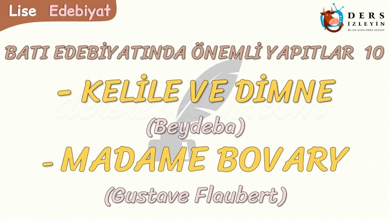 Liseler için hazırlanan bu ders videomuzda Batı Edebiyatının Önemli Yapıtlarından, Beydeba’nın Kelile ve Dimme, Gustave Flaubert’in Madame Bovary adlı eserleri anlatılacaktır. Konunun videosunu izleyerek konuyu daha iyi kavrayabilir ve bilginizi pekiştirebilirsiniz.