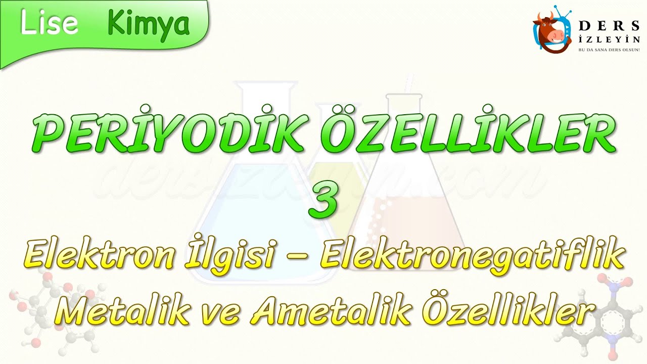 Liseler için hazırladığımız bu videomuzda Periyodik Özelliklerden Elektron İlgisi, Elektronegatiflik, Metalik ve Ametalik Özellikler konularını öğreneceksiniz. Dersi takip ederek konuyu öğrenebilir ya da bilgilerinizi pekiştirebilirsiniz. İyi seyirler ve başarılar.